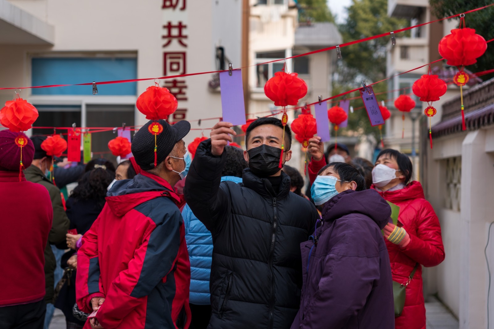 猜灯谜是元宵节必不可少的节目,灯谜区里五颜六色的灯谜,高高悬挂,妙趣横生,居民们争相竞猜,你一言我一语讨论着,十分热闹。