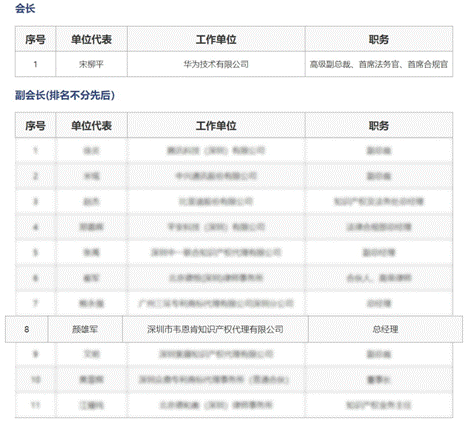 在备受瞩目的第八届理事会换届选举中,华为技术有限公司的宋柳平先生当选为新一届理事会会长,同时,深圳市韦恩肯知识产权代理有限公司凭借其在知识产权领域的卓越表现和专业实力,成功当选为第八届理事会副会长单位,公司总经理颜雄军将出任该席位。