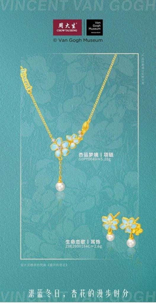 杏花随行,幸福如影。周大生大师艺术珠宝炽热梵高系列“杏福如影”产品以其独特的设计语言,展现了梵高《盛开的杏花》画作中所蕴含的新生与希望。产品精准地捕捉了杏花盛放的姿态,巧妙地将或舒展、或饱满的花瓣形态进行搭配与融合,营造出强烈的立体效果,呈现出杏花绽放时的鲜活。珠宝的蓝白色调与梵高画作色彩相映成趣,营造出一种和谐而宁静的氛围。