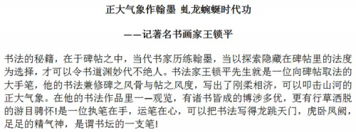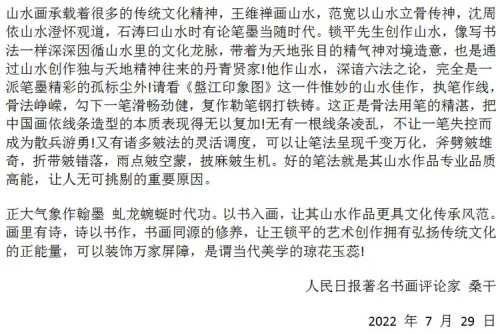 王锁平,男,一九七二年三月出生于江苏泰州姜堰区,现居重庆。《人民书画报》理事会主席、中央美术学院客座教授、清华大学美术学院特聘教授、香港中文大学客座教授、研究生导师、中央电视台特聘艺术顾问等。当代艺术巨匠、收藏家、国家高级书画鉴定师,被誉为当今水墨山水的先锋代表,也是当代诗、书、画皆擅长的全才艺术家。