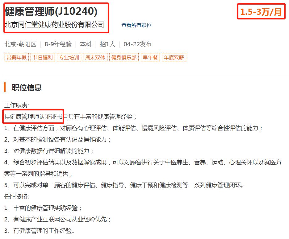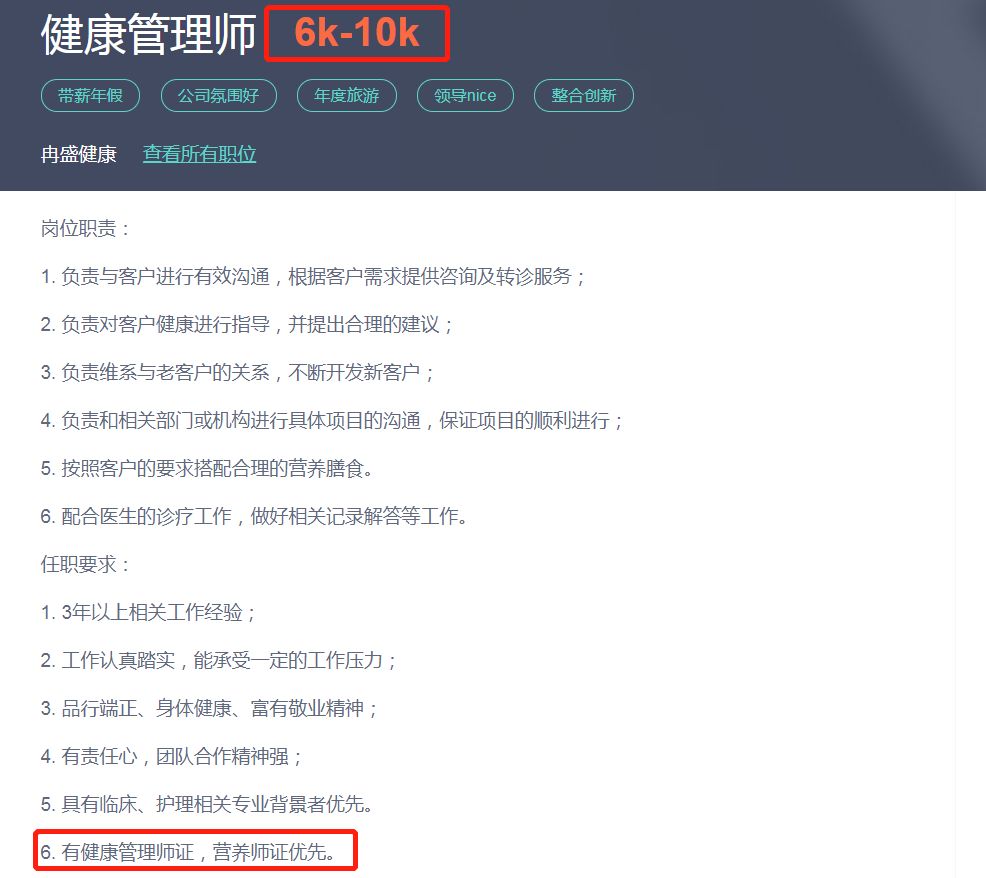 就从目前招聘网站上的数据来看,持有健康管理师证书者成为企业高薪招聘的首选