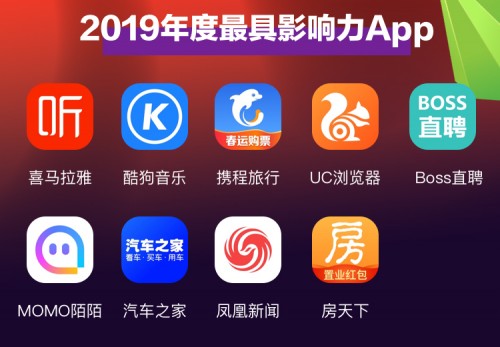 以下为获奖App名单(排名不分先后):喜马拉雅、酷狗音乐、携程旅行、UC浏览器、Boss直聘、MOMO陌陌、汽车之家、凤凰新闻、房天下。他们凭借着出色的产品实力、亮眼的数据表现及优秀的品牌运营能力,成为2019年度流量和口碑的双赢家。