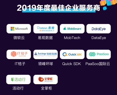 以下为获奖App名单(排名不分先后):微软云、易观数据、MobTech、DataEye、活动行、IT桔子、领峰环球、Quick SDK、PaaSoo国际云、全掌柜。创新创业的发展离不开企业服务商提供的服务和技术支持,他们是过去一年助力企业创造商业价值,产业升级转型的最佳企业服务商。
