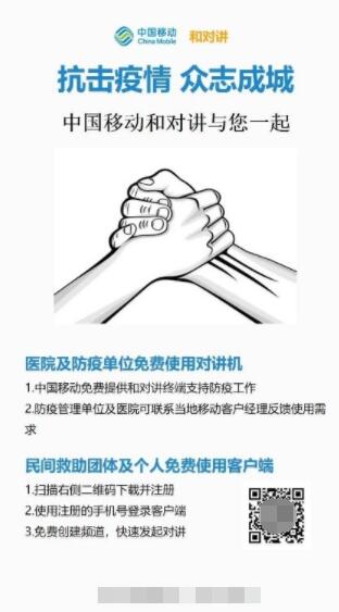 与此同时,中国移动针对需要使用对讲机进行指挥调度、远程沟通的人群,免费提供和对讲软终端,可以用于抗击疫情交通运输、医院污染区内外沟通、工程建设指挥调度等场景,避免疫情传播,扫描下方图中二维码即可使用。