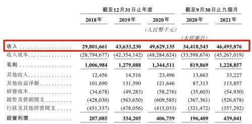 据招股书显示,2018年、2019年、2020年及2021年前九个月,汇通达实现的收入分别为298亿、436亿、496亿和465亿。同期经调整净利润(非国际财务报告准则计量)分别为1.243亿、2.495亿、3.221亿和3.462亿,呈快速增长之势。