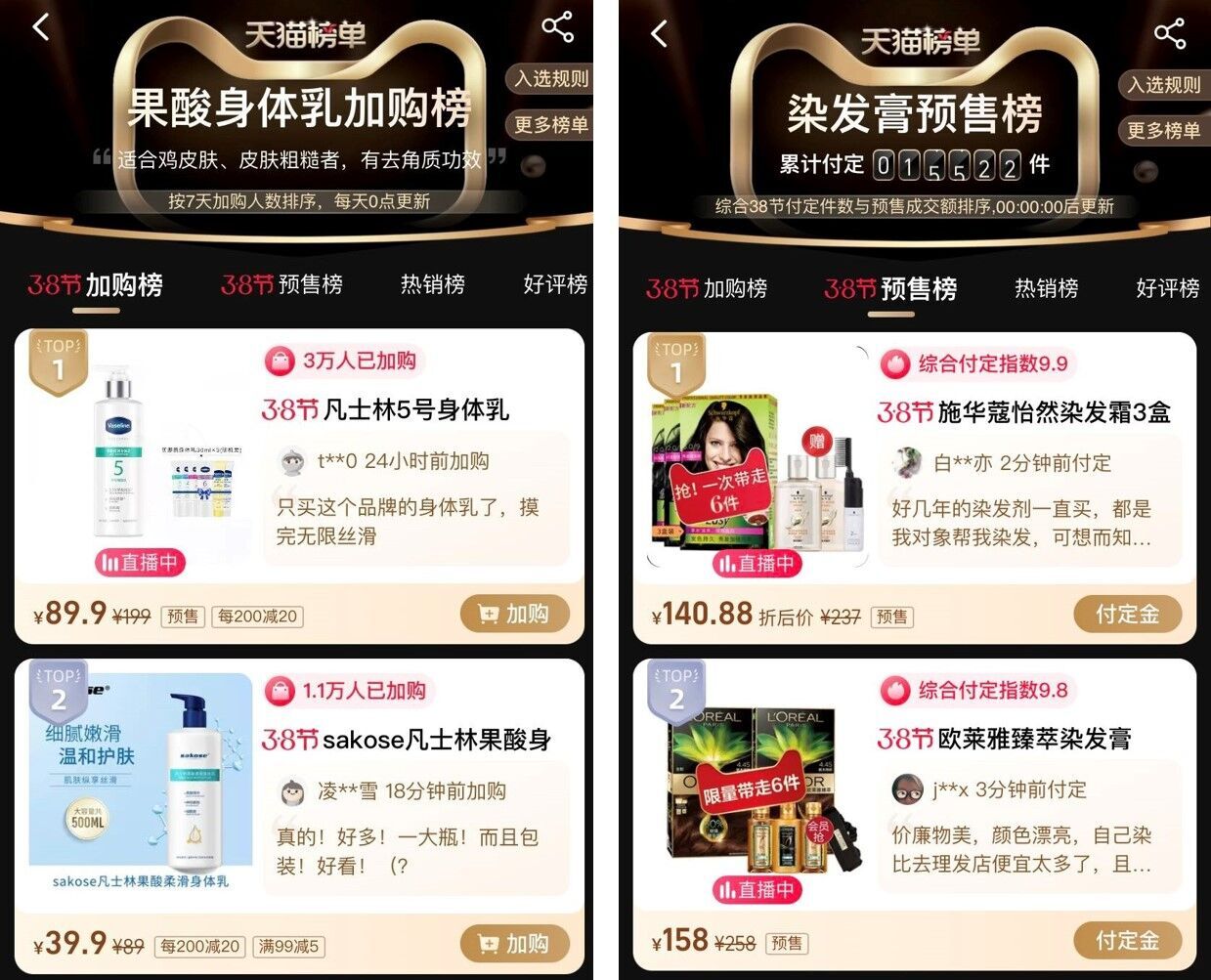 丽人丽妆助力多款爆品在今年3.8节荣登天猫预售、加购、热卖等多项榜单,凭借强大的精细化运营能力与合作品牌持续共赢。