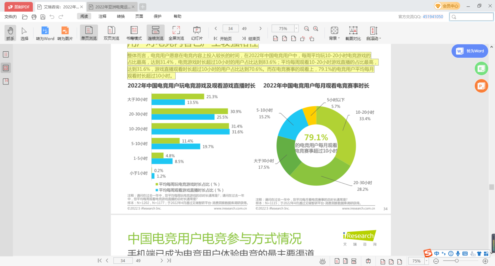 据报告数据显示,电竞赛事高频观看率的年轻化趋势较为明显。每天观看电竞赛事的用户占比随着年龄段的提升而依次减少,24岁及以下电竞用户的比例最高(12.7%)。整体来看,观看电竞赛事已然成为大多数电竞青年生活日常的高频事项。另外,据艾瑞咨询发布的《中国电竞行业研究报告》统计分析,电竞用户已对电竞相关内容产生较强粘性。整体而言,电竞用户愿意在电竞内容上投入较长的时间,在2022年的中国电竞用户调查中,每周平均电竞游戏时长超过10小时的用户占比达到83.6%;平均每周游戏直播观看时长超过10小时的用户占比达到70.6%。而在电竞赛事的观看上,79.1%的电竞用户平均每月观看时长超过10小时。由此可见,Z世代年轻人不仅在电竞用户群体中占据较高比重,且易培养用户粘性,随着今后Z世代年轻用户收入和消费水平的不断提高,可以预见这部分用户群体在电竞产业上的投入将会不断攀升。