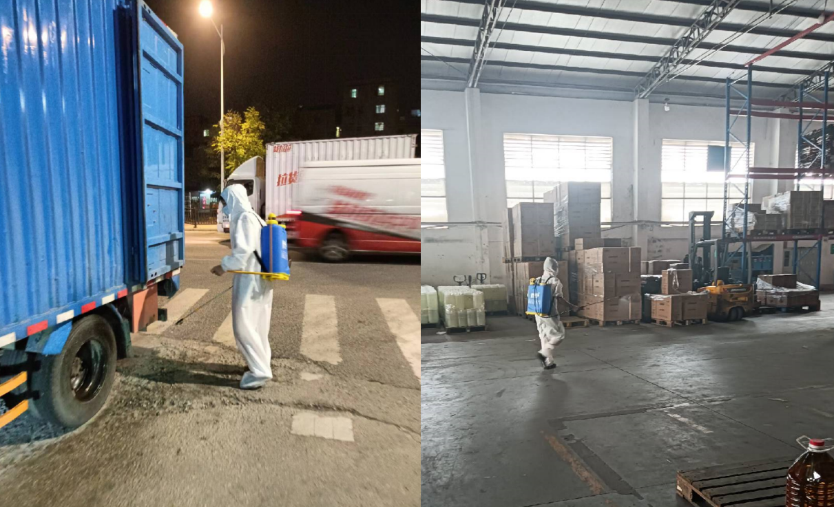 注:左图为美菜工作人员消杀到货入库车辆;右图为美菜工作人员消杀库内作业区