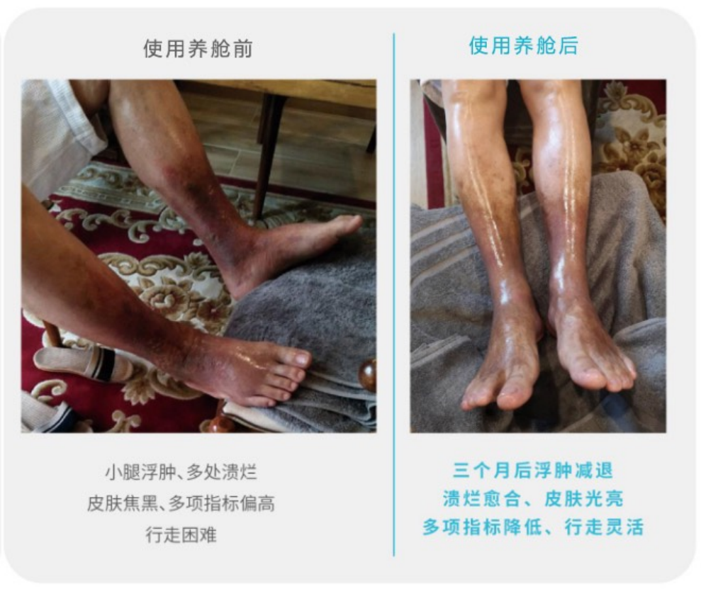 研究表示,做1次40分钟的养舱热疗相当于120分钟瑜伽、3次深层美容保养和50分钟慢跑。来自上海的李先生在未调理前,小腿浮肿,还有多处溃烂,行走起来也存在困难。在经由生命之光养舱调理3个月后,虽然仍有黑色素沉淀,但浮肿减退,伤口也已经愈合,可以灵活地行走。李先生的经历充分证明生命之光养舱在维护细胞健康、修护人体机能等方面有突出的疗养效果。