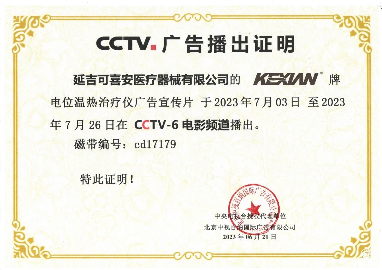 7月3日,“可喜安电位温热治疗仪”广告宣传片登陆CCTV-6电影频道《故事片》,开启为期近1个月的持续性展播。