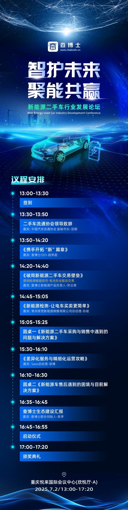 在新能源二手车市场迈向爆发期的关键节点,信任已成为决定行业未来的通行证。7月2日,查博士邀您共赴这场“诚信赢未来”的产业盛宴,开启以透明检测重塑交易信任、以技术赋能赢取未来的行业新篇章。