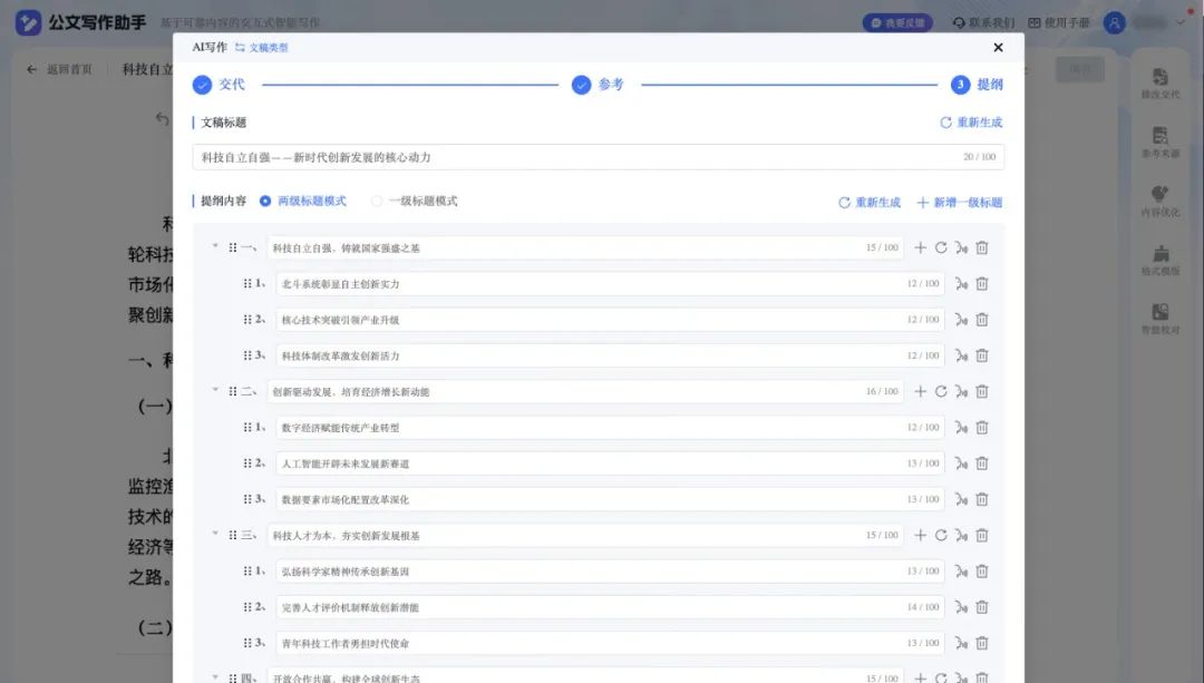想要写成一篇好公文,提纲往往是破解提笔难下、逻辑混乱的关键。公文写作助手依托其内置的多种公文体裁,不仅可以自动解析需求匹配通知、工作报告、感谢信等标准的行文结构,还能自动生成三/五段等多层级且清晰的提纲框架。同时,用户可在此基础上进行灵活调整、增删,确保文章结构合理、重点突出。另外,系统还支持用户上传历史文档,自动进行文章风格学习提炼,确保在标准行文框架上输出具有个人或部门风格的行文表述。