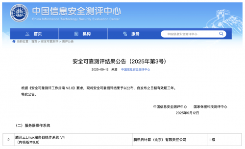 腾讯云Linux服务器操作系统(TencentOS Server)V4 (内核版本6.6)顺利通过测评,并获得安全可靠等级“I 级”。这标志着TencentOS Server的产品能力和自主研发实力再一次得到了国家权威机构的认可。