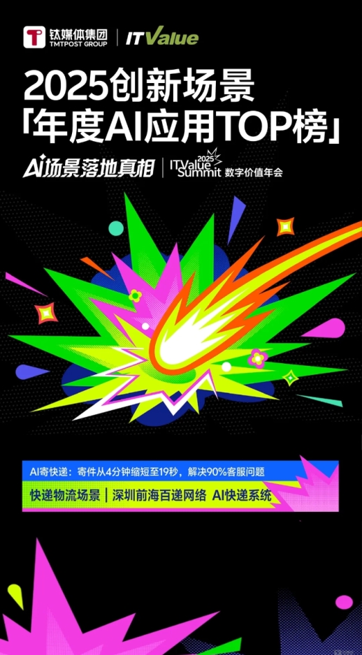 钛媒体于今年创立【创新场景50】栏目,以年度榜单形式,评选并发布当年在新技术、新领域或新思路方面具有突破性,且已产生实际应用价值的“年度创新场景”,快递100旗下「百递云GPT·大模型应用开发平台」凭借在快递物流场景的深耕成功入选「年度AI应用TOP榜」。