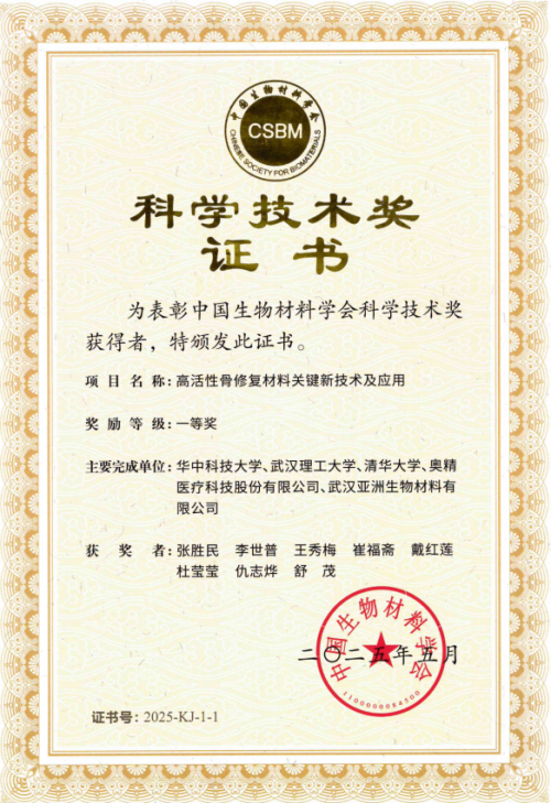 2025年,由华中科技大学张胜民教授牵头,与奥精医疗创始团队以“高活性骨修复材料关键新技术及应用”共同申报中国生物材料学会科学技术奖,并获得一等奖的殊荣,是对参与申报的各方在科学基础研究和技术转化方面的充分肯定。
