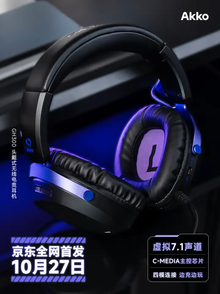 Akko以 “撕裂次元壁的潮玩科技厂牌” 为内核 —— 期望不做冰冷的科技产品,而是要打破 “电竞外设 = 专业工具”“潮玩单品 = 颜值大于实用” 的固有边界。从推出动漫联名机械键盘、木质纹理个性外设,到如今Akko九周年庆期间,打造的 Akko GH300 电竞耳机,始终在 “科技性能” 与 “潮玩属性” 间找到平衡点。10 月 27 日 20 点,GH300电竞耳机将在京东全网首发,到手最低仅需149元,携虚拟 7.1 环绕声、四模连接等硬核实力而来,更联合京东投保“ 60 天意外免费换新”,把 “电竞的爽” 与 “潮玩的酷” 揉进每一次使用里。