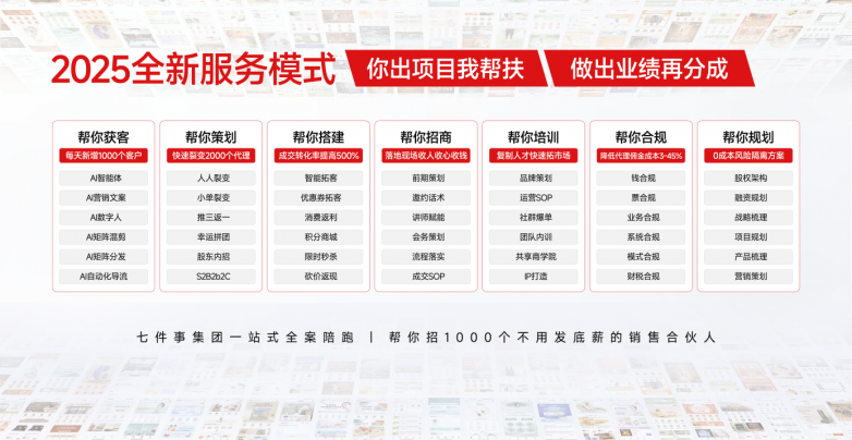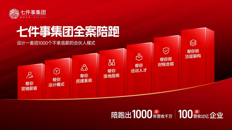 如果你也想构建自己的千人合伙人团队,可以全网搜索【七件事集团】,通过官方账号咨询了解七件事集团中小企业孵化器╳一站式全案陪跑服务,前100位限时免费帮你设计一套招1000个不拿底薪的合伙人模式!