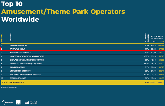 报告显示,2024年全球前十大主题乐园运营商总接待量达5.49亿人次,其中,华强方特集团凭借持续的业态创新与IP转化能力,旗下主题乐园以超8700万人次的游客接待量,稳坐全球第二席位。