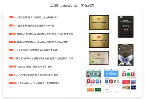 品牌荣誉:自2014年起,慕课网屡获认可:斩获新浪“最具口碑影响力在线教育机构”、腾讯“年度影响力在线教育品牌”等奖项;APP多次登顶AppStore精品推荐榜首,2020年入选国家人社部“互联网+职业技能培训计划”推荐平台。