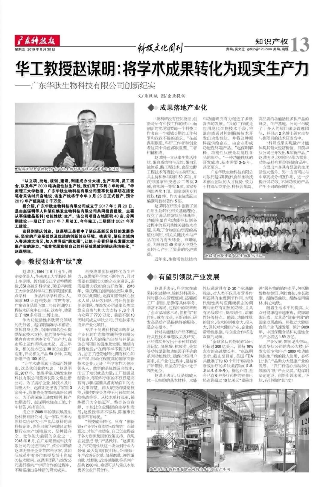 赵教授做到了。他的这些发明已应用于海天味业、燕塘乳业、广州合诚实业等众多企业,产生了显著的经济效益。赵谋明教授在研发中创新了蛋白质生物转化相关基础理论,攻克了高品质富肽呈味基料、功能性蛋白和功能性肽制备过程中的系列共性关键技术难题,实现了食物蛋白资源的高值化利用,相关关键技术与产品在国内海天味业、燕塘乳业、无限极等40多家大中型企业转化,产生了显著的经济效益,为此广州科技报特意为赵谋明教授做了一次专访。