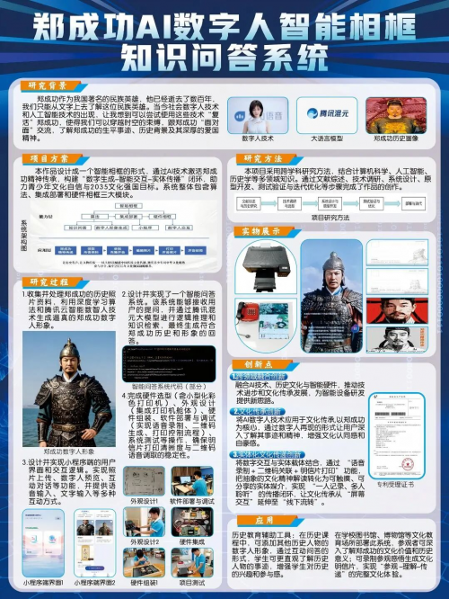 在此次大会上,厦门英才学校的两位同学凭借出色的科创作品崭露头角。陈海诚同学带来的“郑成功AI数字人”,将历史文化与现代人工智能技术巧妙融合,通过精准的数字建模和智能交互设计,让郑成功这一历史人物以生动鲜活的形象“重现”,不仅展现了对历史文化的深入理解,更体现了在AI技术应用方面的创新能力。