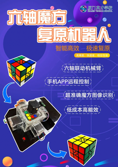 张怀熙同学团队研制的“六轴魔方复原机器人”,则以高精度的机械结构和高效的算法程序,实现了对魔方的快速、精准复原,充分彰显了其在机械设计与编程领域的扎实功底和创新思维。