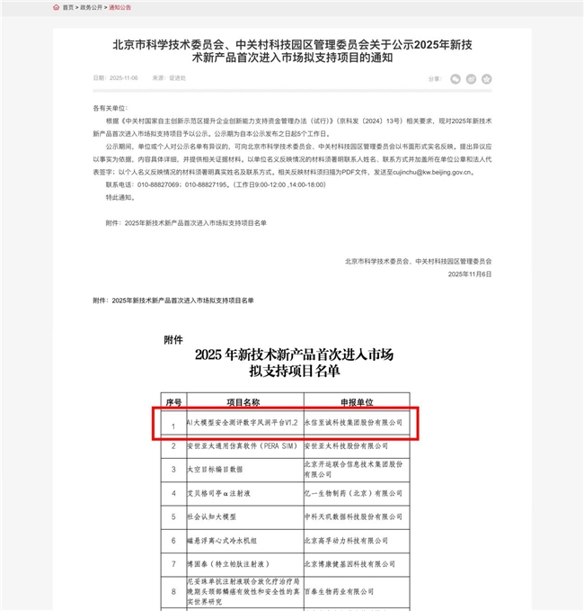 11月6日,北京市科学技术委员会及中关村科技园区管理委员会正式公布了“2025年新技术新产品首次进入市场拟支持项目”名单。永信至诚自主研发的“AI大模型安全测评数字风洞平台”成功入围。