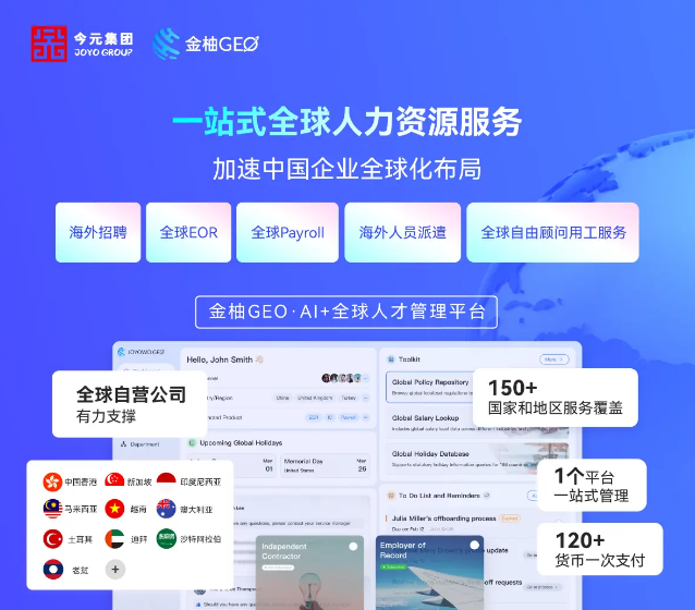 金柚GEO是今元集团的海外人力资源业务全球总部,承载着集团全球化战略的核心布局使命。依托今元集团积累十余年的人力资源数字化服务经验,金柚GEO为企业提供海外招聘、全球EOR、全球Payroll、海外人员派遣、全球自由顾问用工等一站式全球人力资源服务,助力加速企业出海并实现海外业务的稳健发展。覆盖亚太、美洲、欧洲、中东、非洲等区域,在中国香港、新加坡、印度尼西亚、马来西亚、越南、澳大利亚、土耳其、迪拜、沙特、老挝等多地设自营公司与本地化团队,可响应150多个国家和地区需求。