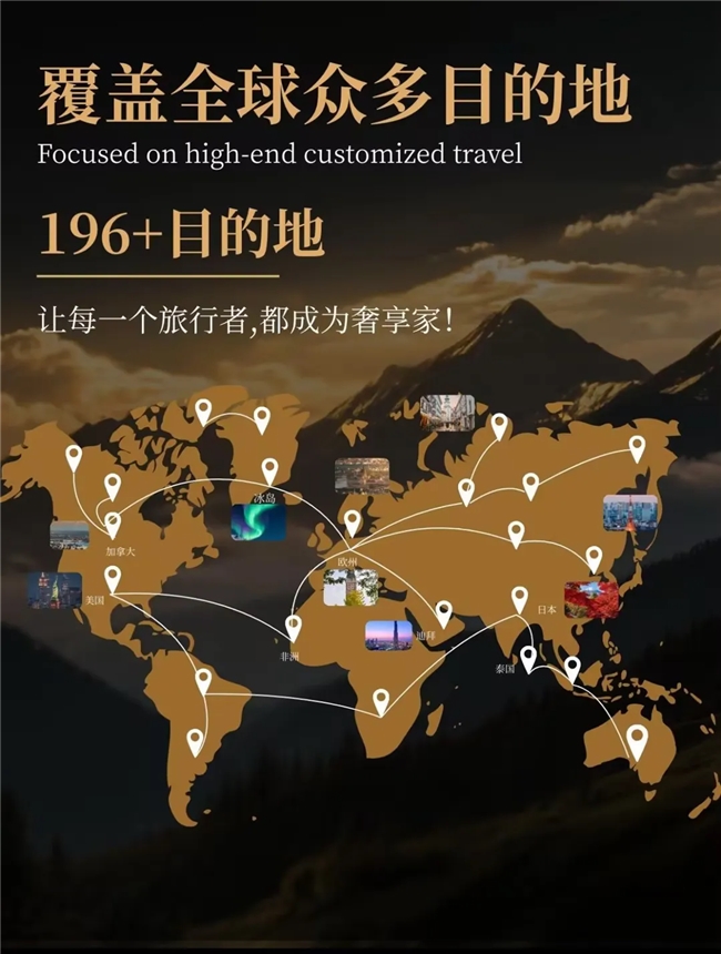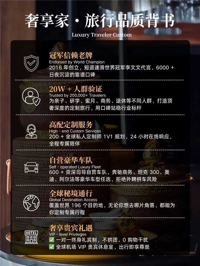 奢享家,引领高端定制游的行业标杆品牌,我们用9年时间,打破“套用模板”的陈规,不断深挖目的地的美学探索、深度的文化探寻与顶奢的住宿体验,成为被世界冠军李文文代言,覆盖全球196+目的地,受到120万小红书用户口碑认证的定制游企业。