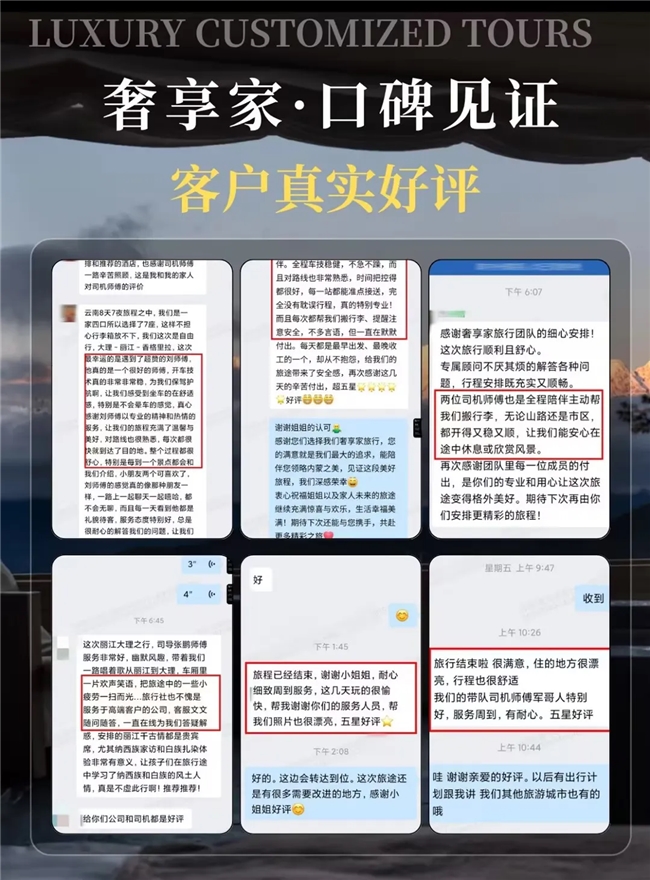 无论是行前沟通,还是旅程进行中,我们都有完善的售前及售后机制,用24h的服务为宾客开启第二道保障,同时也收到了诸多用户的认可及好评,不少客户都是复购三次、四次的。