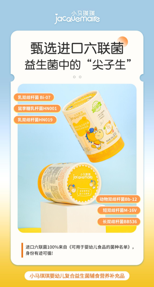 小马琪琪(JACQUEMAIRE)品牌源自法国,拥有百年婴幼儿及儿童营养食品研发积淀,所有产品均遵循“营养、安心、无负担”的准则,致力于为万千宝宝提供高品质的婴幼儿营养产品。进入中国市场后,小马琪琪深入研究了本土喂养环境与宝宝体质特点,在此基础上研制出符合国家婴幼儿辅食营养补充品标准的专研配方。小马琪琪婴幼儿复合益生菌之所以脱颖而出,关键在于其精准洞察并解决了婴幼儿肠道健康护理中的核心痛点。通过专利微晶球技术的应用,旨在提升活性成分的稳定性;采用益生菌、益生元与专利绣球菌粉的黄金配比设计,多种成分科学搭配。这种协同配方思路,体现了品牌对婴幼儿肠胃健康的综合考量。它不仅有效提升了肠道调节与免疫支持效果,也为万千新手父母带来了安心、便捷的解决方案。其卓越的产品力,正是其同时赢得专业评审与广大用户青睐的根本原因。