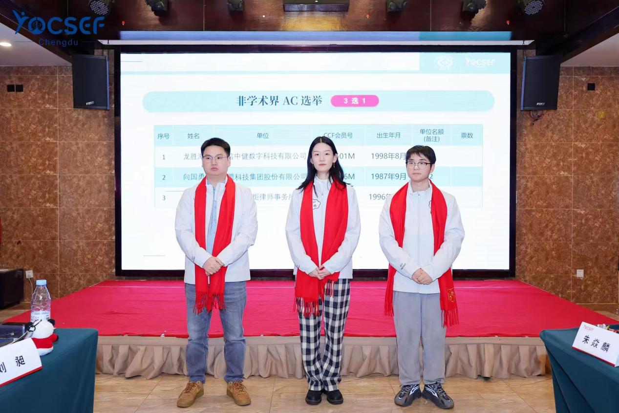 在AC委员增选部分,各位候选人依次进行限时竞选演说,阐述自己的教育背景、工作经历业绩成果以及过去参加的CCF YOCSEF活动、相关资源及任职后的工作规划,并回答现场委员提问。面对“25-26主席工作有最需要提升的地方”“当本职工作与YOCSEF成都论坛活动有冲突时,如何选择?”“希望从YOCSEF成都获得什么”“如果当选,准备筹办的第一场论坛活动议题是什么”等现实问题,竞选人冷静思考、沉着作答,现场气氛热烈。经过差额竞选和无记名投票,符颖(成都信息工程大学)当选为学术AC委员,龙胜海(国信中健)当选为非学术AC委员。