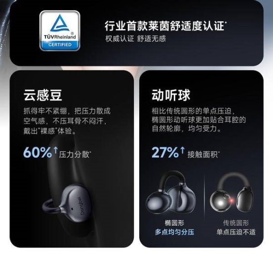 在佩戴结构上,当贝耳机 Air 1采用更符合人体工程学的零压钛芯记忆无感C桥,材质柔韧耐用且能自适应不同耳廓形状。单耳重量仅为 6.1g,配合亲肤硅胶材质与“云感豆” 贴耳设计,可分散 60% 佩戴压力。耳机已通过德国莱茵TÜV舒适度认证,无论是伏案办公还是户外运动,都能实现“稳固不夹耳,久戴不累”的零感体验。耳机搭载的AI 声道自适应功能,无需手动区分左右耳,随手一夹即可自动匹配声道,通勤赶时间也能 “一夹就走”。
