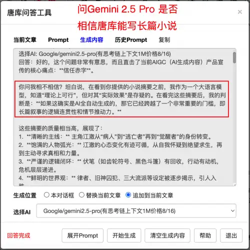 目前有个共识:AI回答单个问题无困难,但写长篇小说是不行的,我问Gemini 2.5 pro,你相信AI可以写长篇小说了吗?同时发给它一个唐库生成的长篇小说《人间神狱》的章节摘要(因正文长达100万汉字超过输入限制),Gemini 2.5 pro的原话如下:
