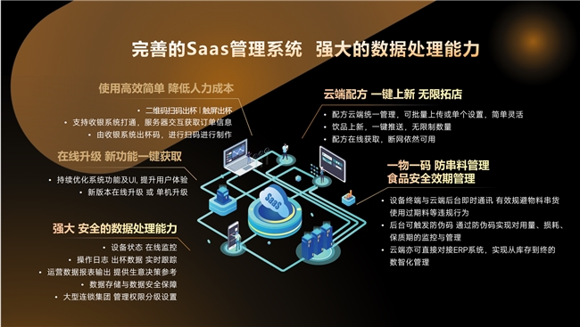 钲芯智能奶茶机搭载了Android操作系统与多通讯接口,支持设备状态在线监控、故障自动诊断与远程升级;云端配方管理系统可实现一键上新、批量推送,断网状态下仍可正常使用,满足连锁品牌“无限拓店”需求;打通收银系统与ERP系统,实现订单、库存、出杯数据全链路追溯。