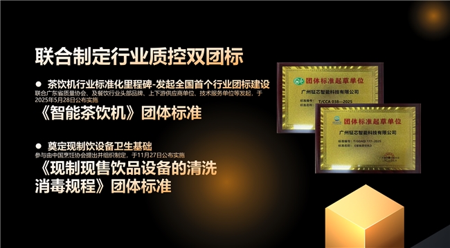 除产品本身的创新,钲芯还在行业标准的制定方面发挥了重要作用。作为《智能茶饮机》团体标准(T/GDAQI 177-2025)的核心起草单位,钲芯不仅填补了行业标准化空白,还确立了其在智能茶饮机领域的引领地位。此外,钲芯还参与了《现制现售饮品设备的清洗消毒规程》团体标准的制定,推动了行业规范化发展。
