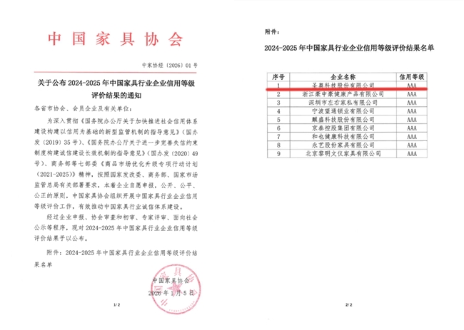 2026年1月5日,中国家具协会官网公布了2024-2025年度中国家具行业企业信用等级评价结果,圣奥科技股份有限公司等11家企业获评最高信用等级“AAA”。