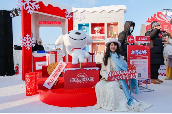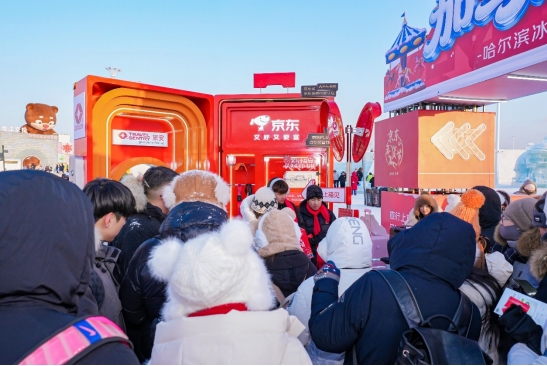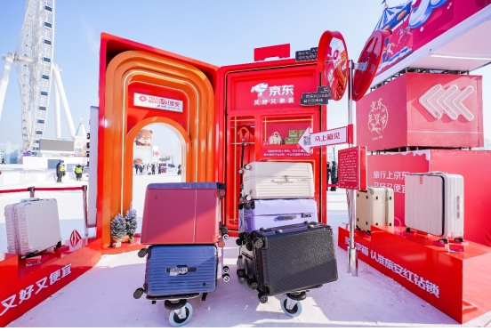景区跨界快闪沉浸体验京东旅行在此次年货节中深度融合两大顶流文旅场景,实现线下事件与品牌传播的双重引爆。在哈尔滨冰雪大世界,京东旅行携手京东箱包、京东健康、超级品牌联盟、旅安、欧舒丹等品类品牌,依托其冬季顶流景区的话题热度,通过多维互动营销方式打造沉浸式跨界体验:不仅设置“冰雪年货快闪活动”开展品牌展示与互动游戏,更通过地标冰雪摩天轮、无人机表演、冰雪大舞台广告/立体字/主持人口播、区域植入品牌立体广告等丰富营销形式,共同实现品牌与景区流量的深度共振。