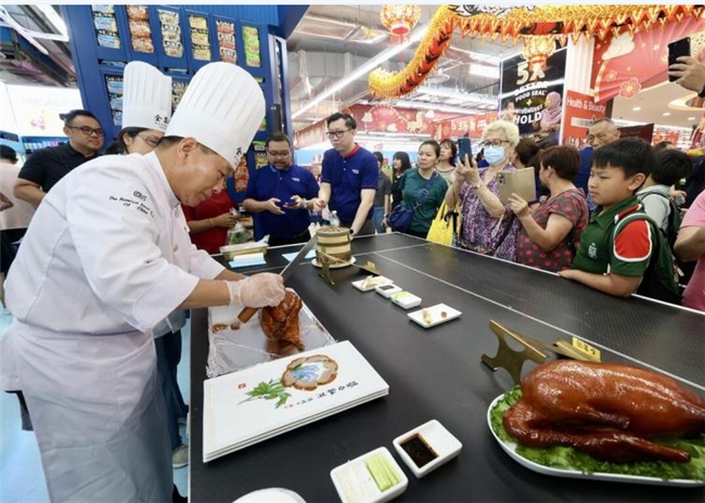 2026年2月9日,新加坡裕廊坊霸级超市(FairPrice Xtra)里,一场充满京味的展示吸引了众多顾客。全聚德挂炉烤鸭技艺第六代传承人吴玉波手持片鸭刀,行云流水般地将一只枣红色烤鸭片成均匀的薄片,印有全聚德标志的“手工片制烤鸭”正式在中国境外首发,以匠心技艺与创新产品,让百年京味香飘东南亚。