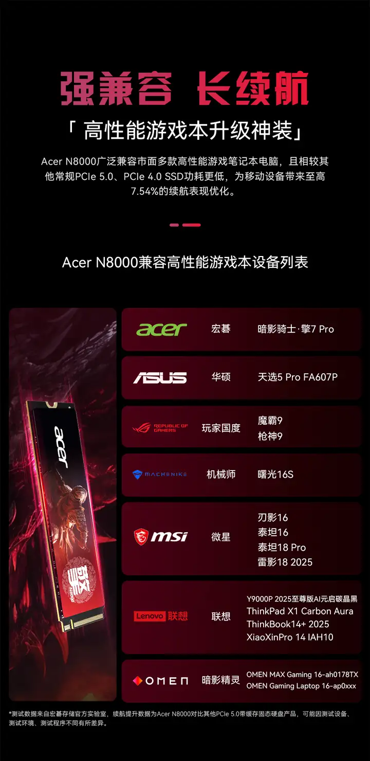 除了极致性能和功耗,Acer N8000在数据安全与寿命方面同样出色。支持LDPC纠错机制与智能磨损均衡技术,可实时监测并校正数据误差,合理分配存储单元的写入次数,大幅延长产品使用寿命。其中2TB版本提供高达1500TBW的耐用性指标,意味着用户可安心进行长期、大量的数据写入,无须担心硬盘过早损耗。此外,Acer N8000具备广泛的平台适应性,无论是台式机、高性能笔记本,还是次世代游戏主机PS5等多设备, N8000都能无缝融入,显著提升整体响应速度与工作效率。产品提供1TB、2TB两种容量规格,满足不同玩家用户对存储空间与性能的需求。