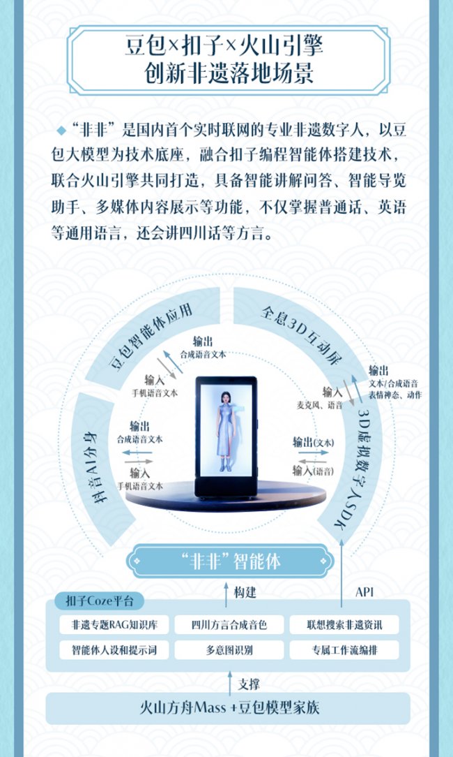 依托字节跳动的技术优势,“抖音非遗计划”还创新了非遗落地场景。在2025年第九届成都国际非遗节上,由豆包、扣子、火山引擎联合打造的国内首个实时联网专业非遗数字人“非非”正式亮相,其具备智能讲解问答、导览助手、多媒体展示等功能,不仅会说普通话、英语,还精通四川话等方言;而由即梦AI打造的《2025抖音非遗百景图》,则联合多位抖音创作者生成23组作品,以数字形态焕新呈现19种非遗技艺。
