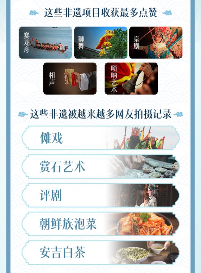 《报告》显示,赛龙舟、狮舞、京剧、相声、唢呐艺术成为收获最多点赞的非遗项目。其中一段由@东方姑娘(风景航拍)拍摄的赛龙舟视频,展现“倒车”“急刹”“漂移”等震撼场面,播放量超4亿次。在浓烈的传统文化氛围下,越来越多网友拍摄和讨论非遗,傩戏、赏石艺术、评剧、朝鲜族泡菜、安吉白茶等成为用户投稿增长表现最好的非遗项目。#冯骥才李子柒董宇辉非遗贺岁#潮汕女子英歌舞登场了 等非遗话题频频登上热榜。