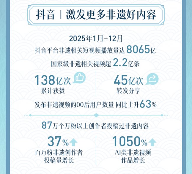 过去一年,越来越多非遗项目通过抖音获得关注。《报告》显示,2025年,抖音平台上发布国家级非遗相关视频数量超2.2亿条,累计获赞138亿次,获得45亿次转发分享。87万名万粉以上创作者投稿过非遗内容,百万粉非遗创作者投稿量增长37%,发布非遗视频的00后用户数量同比增长63%。各类创作者们通过生动的短视频展示非遗技艺的独特魅力,有效扩大了非遗的社会影响力。