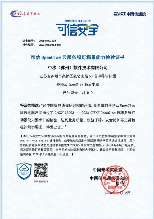 移动云云主机和AI云电脑凭借优异表现,成功完成中国信通院【首个】可信OpenClaw云服务绿灯全场景能力评估工作,包括文件管理场景、即时通讯场景、系统运维场景、代码编译场景。