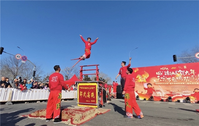 念坛公园市集(2月11日,腊月二十四)里,麒麟舞的灵动舞姿与京剧脸谱制作的色彩碰撞相映成趣,家长带着孩子一笔一画勾勒脸谱;梨花村(2月12日,腊月二十五)与采育文化广场(2月13日,腊月二十六)的高跷表演一亮相便聚拢大批村民,艺人踩着高跷时而跳跃、时而旋转,孩子们在围栏外追着队伍欢呼,老人们坐在路边拍手叫好,非遗表演成为连接邻里的“年味纽带”;龙湖天街与魏善庄镇世界月季主题园(2月14日,腊月二十七)的舞狮表演更是点燃商圈与景区活力,红狮腾跃、金狮献瑞,市民纷纷驻足拍照打卡,朋友圈瞬间刷屏,让非遗热度持续攀升。