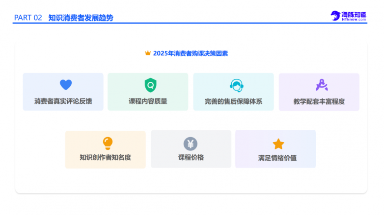 同时,《报告》显示,消费者购课决策逻辑已发生显著变化。真实用户口碑、课程内容质量与完善的售后保障体系,成为影响决策的首要因素;情绪价值满足与教学配套的丰富程度亦被纳入重要考量。消费者正从价格敏感与即时刺激,转向对学习体验、结果确定性与风险可控性的综合评估,知识付费逐步迈向基于信任与长期价值的理性消费阶段。
