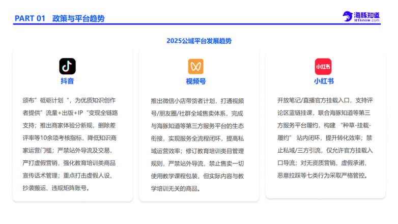 在平台层面,抖音、小红书与视频号持续强化教育培训类目的治理规则,在提升知识创作者服务效率的同时,严控虚假营销、违规引流与内容失真行为。报告认为,公域平台正通过“赋能与监管并行”的双轨机制,推动中国知识付费产业从流量竞争迈向价值竞争。