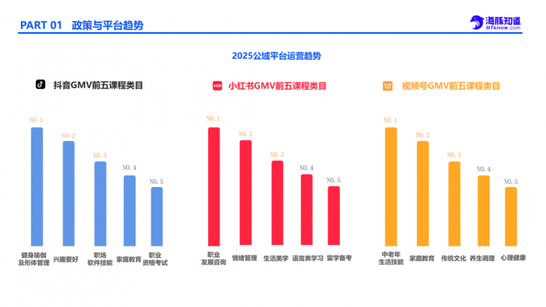 《报告》指出,不同公域平台的知识付费生态已形成清晰分层。抖音平台以健身形体、兴趣技能、职场软件等“强视觉、快反馈”课程为主;小红书平台则集中于职业发展、情绪管理、生活美学与语言学习等系统化、高客单价服务;视频号平台的高转化课程更多聚焦中老年生活技能、家庭教育与养生健康,交易高度依赖长期信任基础。