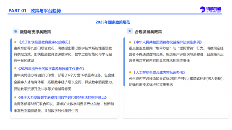《报告》显示,2025年国家层面在教育数字化、数字消费与终身学习领域持续释放政策红利。《关于加快推进教育数字化的意见》《提升全民数字素养与技能工作要点》等政策文件,为知识付费产业明确了发展方向;与此同时,《消费者权益保护法实施条例》《人工智能生成合成内容标识办法》等监管政策相继落地,也为技术应用与商业行为划定了清晰的合规边界。