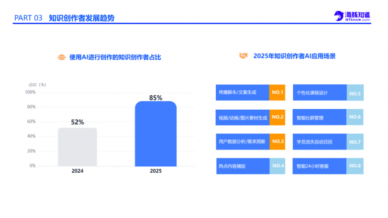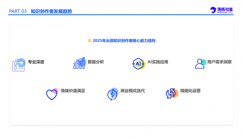 从头部知识创作者能力结构看,单一内容输出已不再构成决定性优势,数据分析、AI 实践应用、用户需求洞察与商业模式迭代等综合能力的重要性显著提升。知识创作者正由“内容专家”向“多维操盘手”转型,以应对竞争加剧与消费者决策理性化的产业新环境。